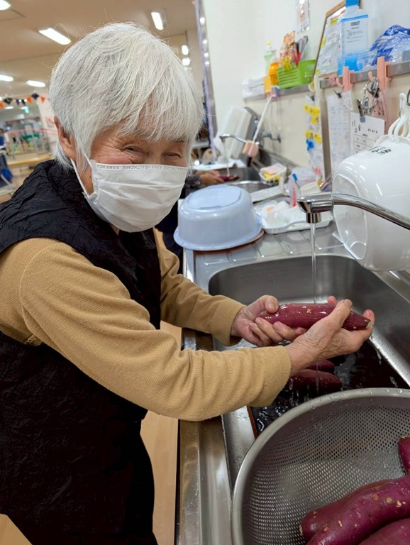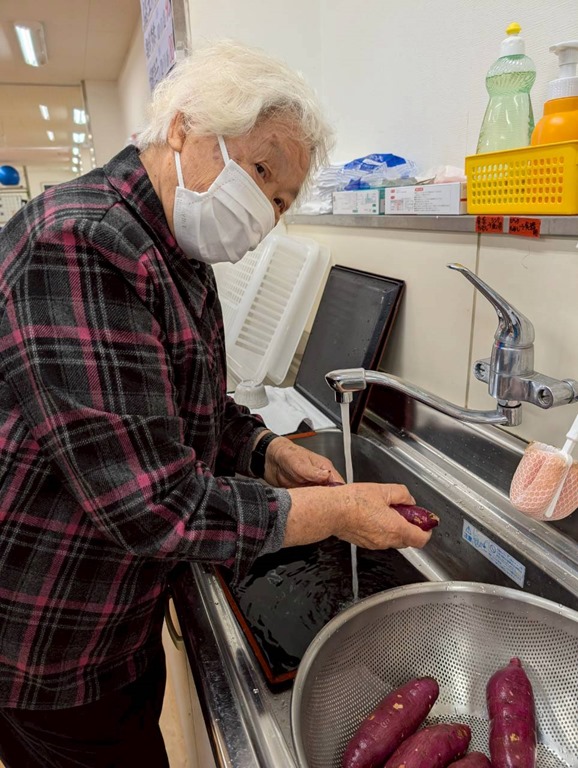 午前中のうちにさつまいもを洗っておきます。長年主婦をされてきた方達、丁寧に指でこすって洗って下さいました。