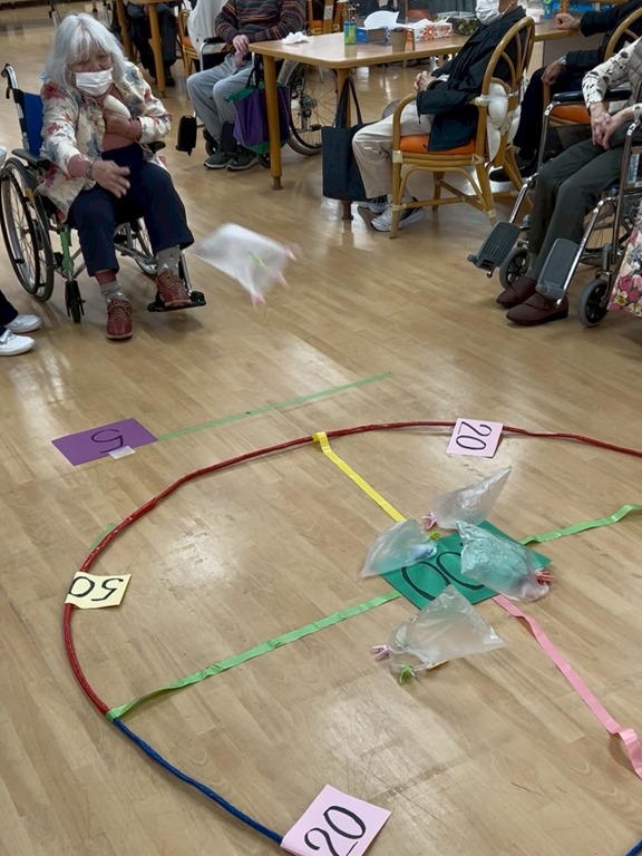 スタッフから「高く投げると空気が入って上手に飛びますよ」とアドバイスを受けると、皆さん上手に投げていました。3回とも100点に入り、手を挙げて喜んでいらっしゃる方もいました。