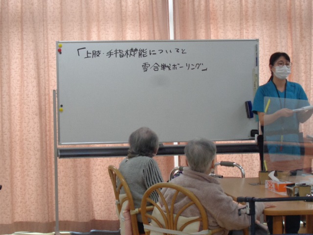 今回のリハビリ教室は作業療法士が担当し、上肢・手指の機能についてと雪合戦ボーリングを行いました。